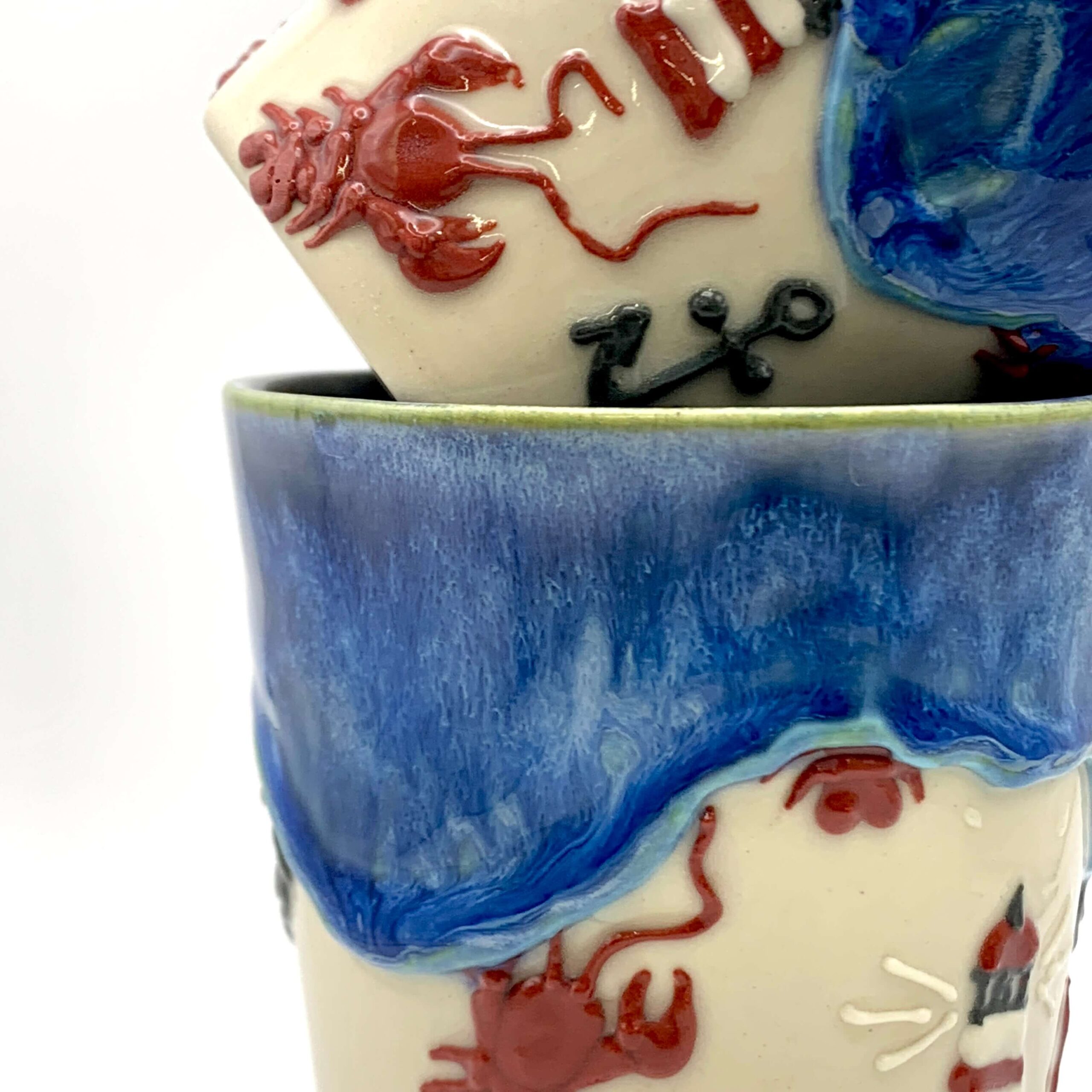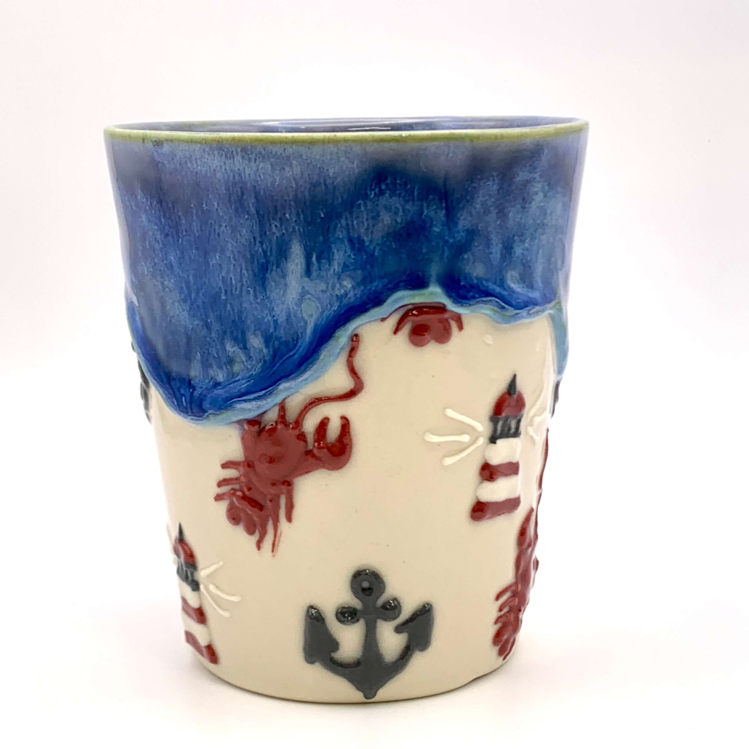 Embrace coastal living with our unique handmade mug featuring 3D lobsters, anchors and lighthouses, hand-piped around its surface. Each piece is a unique work of art, meticulously crafted from high-quality, durable mid-stoneware.