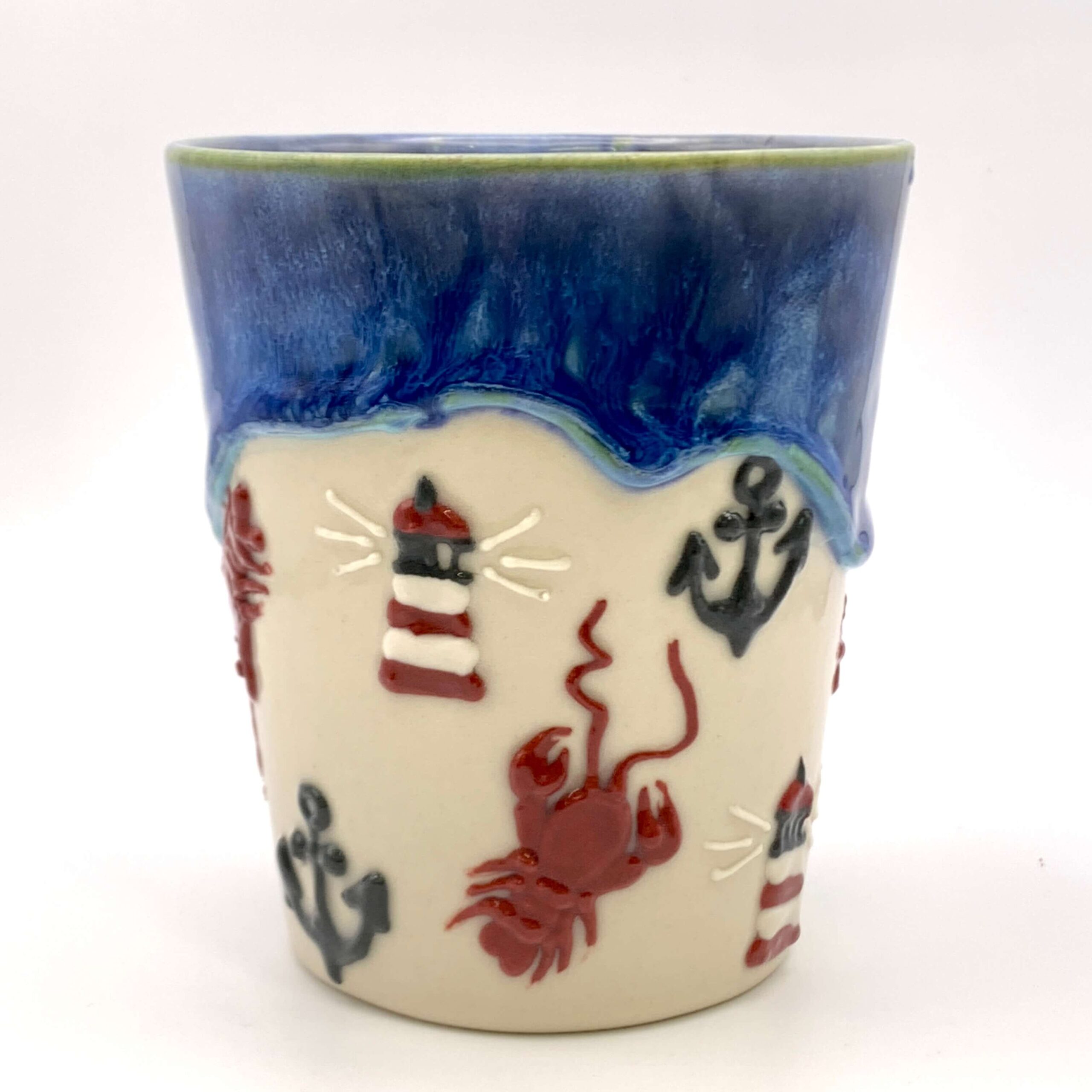 Embrace coastal living with our unique handmade mug featuring 3D lobsters, anchors and lighthouses, hand-piped around its surface. Each piece is a unique work of art, meticulously crafted from high-quality, durable mid-stoneware.
